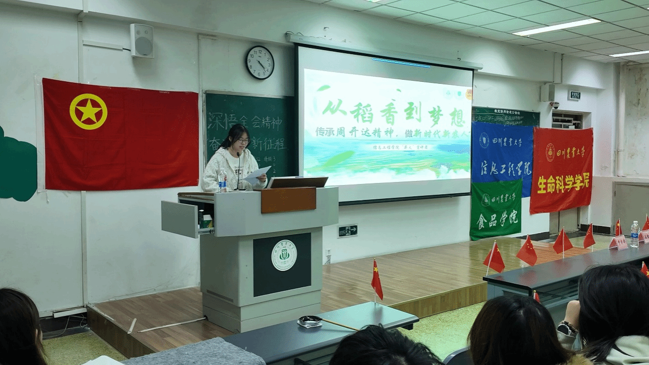 班团活动在激昂的共青团团歌声中拉开序幕。学院“薪火”宣讲团成员李婷婷以《从“稻香”到梦想——传承周开达精神,做新时代新农人》为题展开宣讲,结合农业科学家周开达的感人事迹,鼓励青年扎根专业、服务三农,在乡村振兴中书写青春篇章。