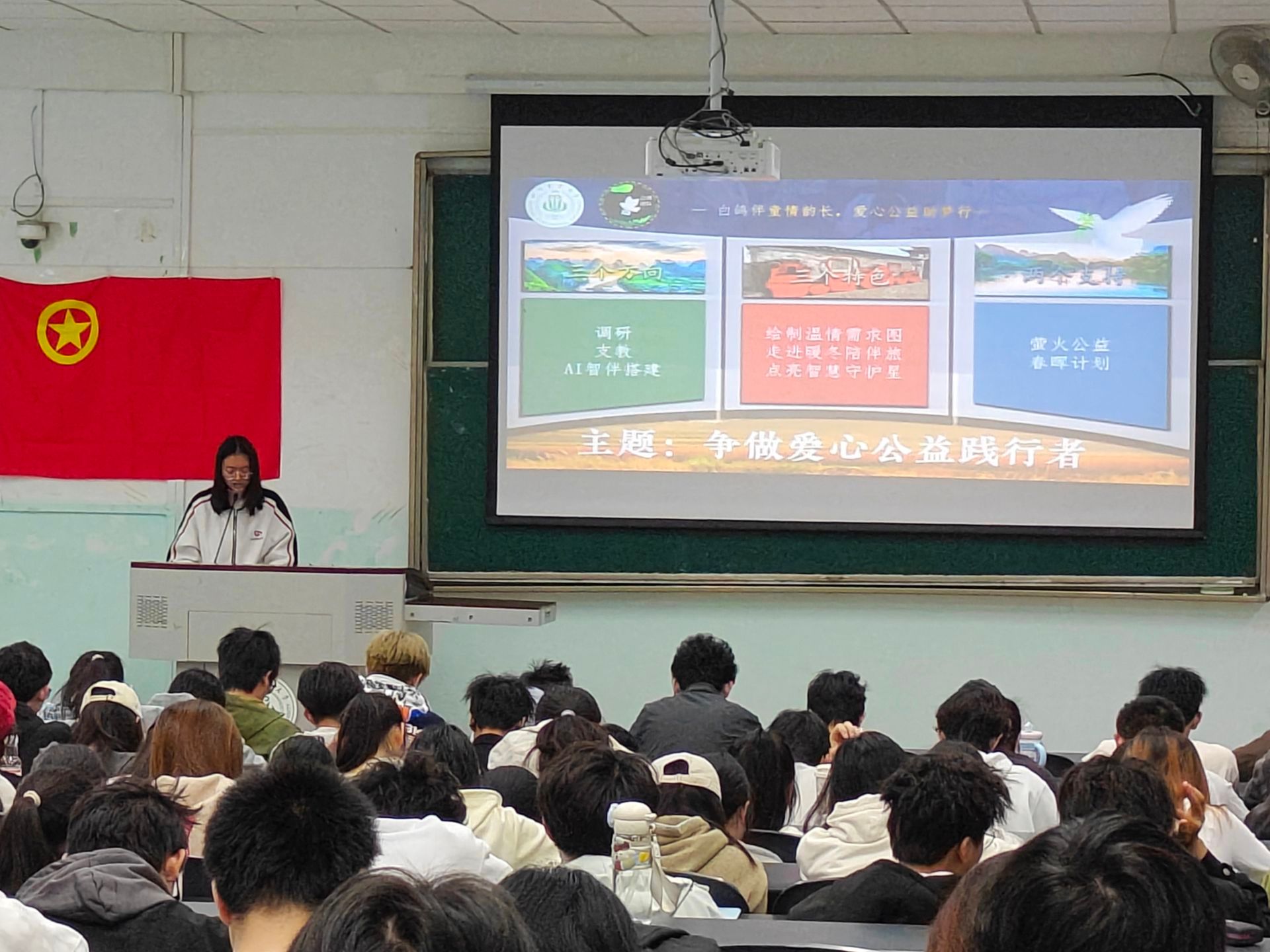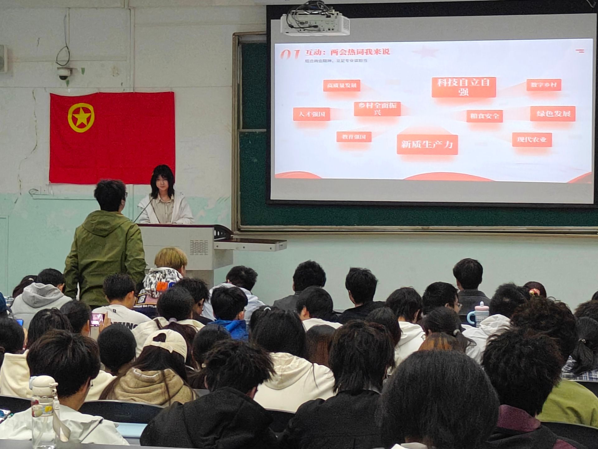为深入学习贯彻2026年全国两会精神与中央一号文件要求,引导青年学子将专业所学与国家发展需求紧密结合,把个人理想融入乡村振兴与强国建设大局,2026年3月31日16时20分,信息工程学院计算机202505、大数据202501、大数据202502、大数据202503、大数据202504、大数据202505团支部于10A-401联合开展“感悟两会精神,喜悟百廿芳华”主题班团活动。200余名青年学子齐聚一堂,以理论学习、嘉宾宣讲、互动研讨、实践分享等多元形式,凝聚青春共识,勇担时代使命,让两会精神在青年心中落地生根、见行见效。