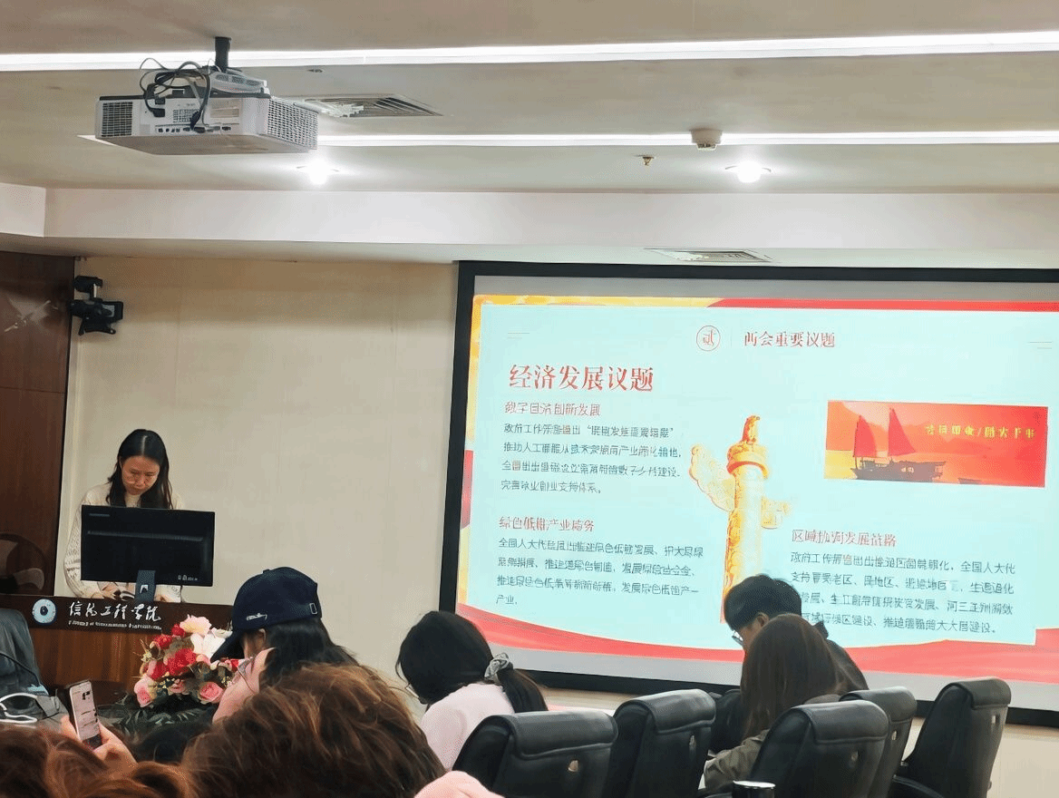 为深入学习贯彻2026年全国两会精神,引导青年学生准确把握国家发展大势,强化使命担当。3月23日,信息工程学院全体学生干部在综合楼414进行两会精神专题学习。由先锋团队的陈妍琳同学进行主题内容分享。