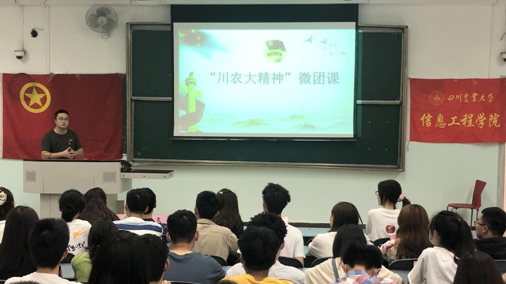 活动在主持人庹晓兰的引导下,以齐唱共青团团歌拉开了帷幕。随后,院团委书记黄锎靓老师以“我眼中的川农大精神”为核心,从川农大精神是什么和川农大精神如何产生的两个问题展开,结合学校和学院的发展历程,以及期间涌现出的优秀人物事迹,特别是我院老前辈、退休老教师王超和宋勤两位老师在艰苦岁月为学院建设和专业建设无私付出的励志故事,为同学们带来了一场精彩而感人的微团课。黄锎靓表示,“爱国敬业、艰苦奋斗、团结拼搏、求实创新”的川农大精神是一代代川农人留给我们的宝贵精神财富,是让师生快速成长、学校走向辉煌的根本支撑,我们要认真去感悟、去传承、去践行。