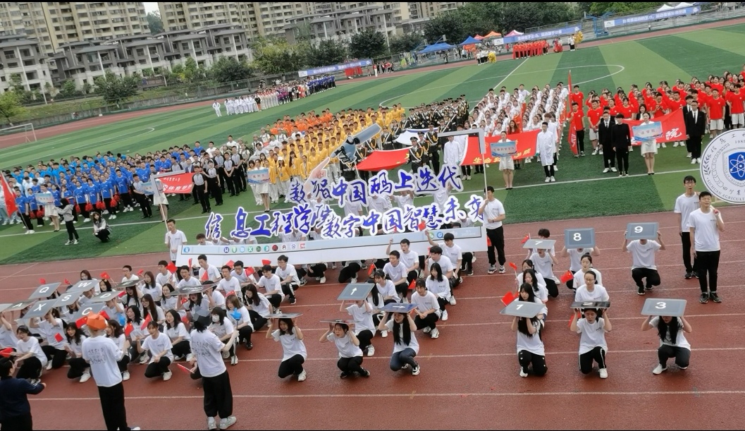在方阵表演中,我院代表队队员身穿纯白色院服在副院长李军的带领下,目光坚定,迈着整齐划一的步伐朝着主席台前走去。主席台下,方阵队员们一部分手举字母组成“键盘”,一部分构成“电脑屏幕”,“屏幕”上的人手与机械手相互交握,象征着人机集合的理念。随着一人在键盘上敲击,屏幕上陆续跳出一个个文字——信息工程学院,数字中国·智慧未来,数字中国·码上迭代!响亮的口号也随之响起,程序员们用自己的方式展示信息工程院的巧思和趣味。极富学院代表性的设计赢来满堂喝彩。除本院外,其他学院方阵也精彩纷呈,法学院着红衣,呼口号,气势如虹,步履铿锵;理学院带来了一首《快乐崇拜》,轻快活泼的舞步将大家带入了欢乐的海洋……