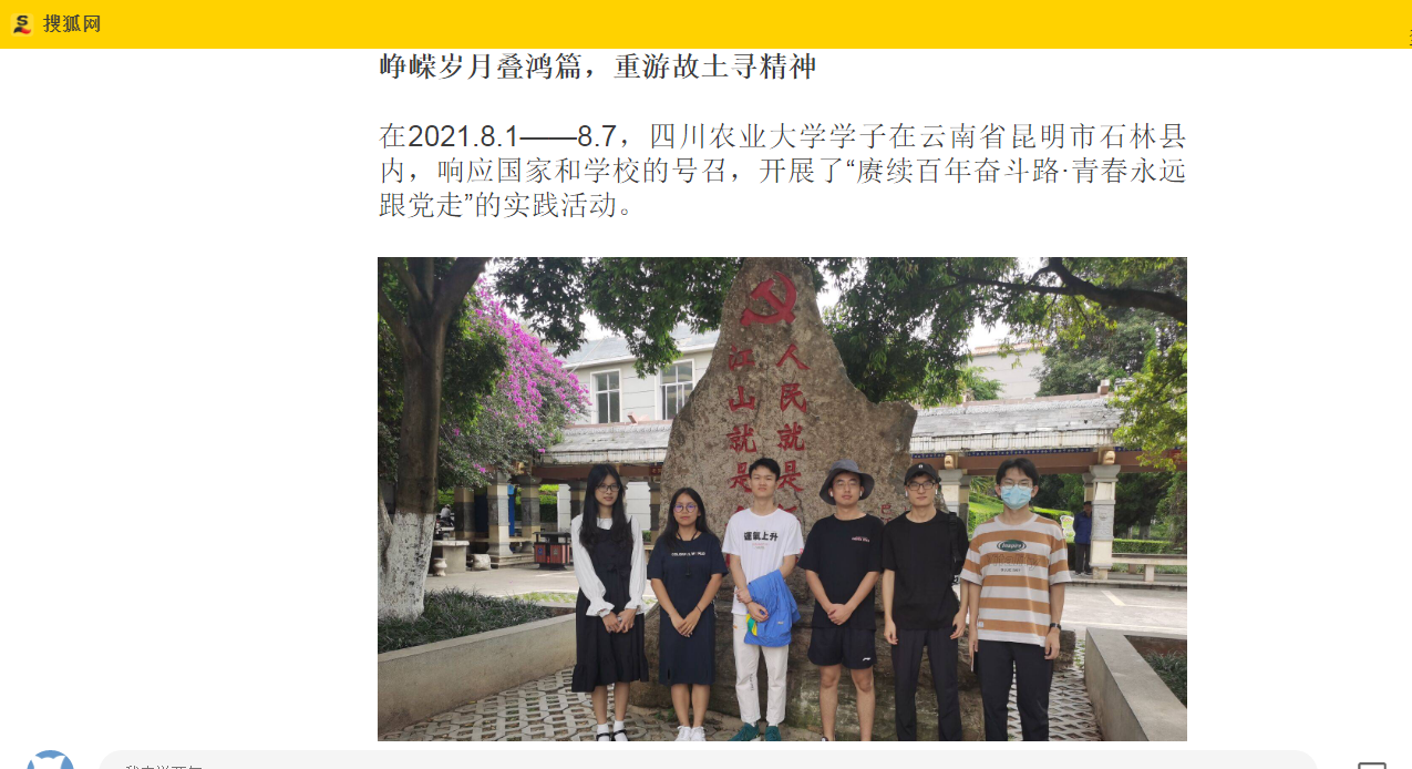 在2021.8.1——8.7,四川农业大学学子在云南省昆明市石林县内,响应国家和学校的号召,开展了“赓续百年奋斗路·青春永远跟党走”的实践活动。
