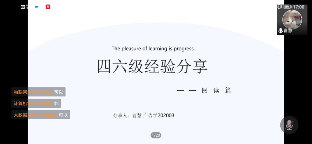 为帮助同学们掌握正确有效的英语学习方法,熟悉大学生英语四、六级考试流程,提高同学们考试过级率。2021年11月26日,信工院联合艺传院合办“执经验之笔,书过级篇章”英语四、六级交流会。本次活动特邀高分通过四、六级考试的文蔡灿、苏畅、曹慧同学做经验交流分享。本次交流会线上开展。