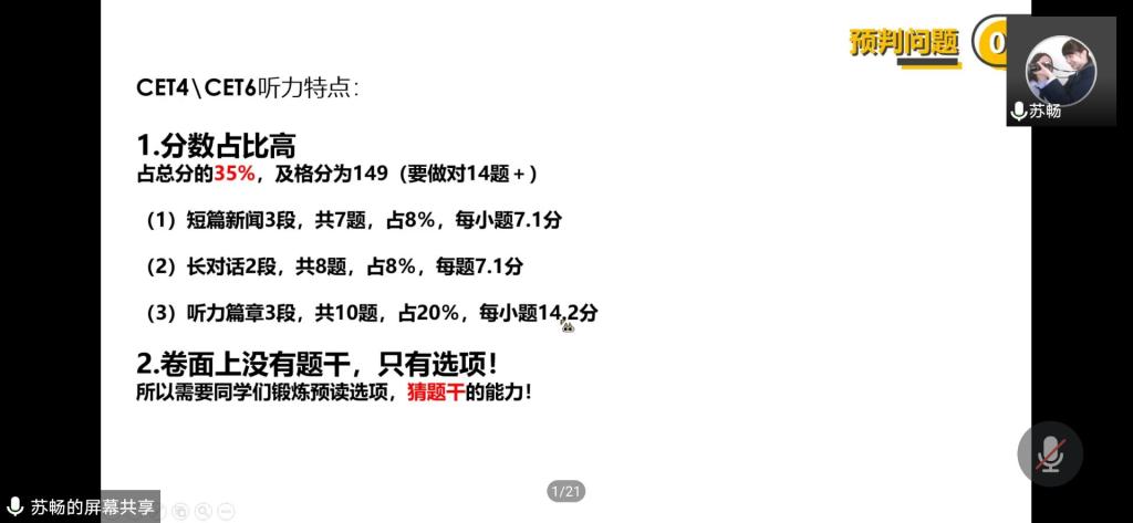 会议伊始,信工院的文蔡灿同学向大家分享了写作翻译的经验,建议同学们在写作时采用三段式结构,把握要点,注重平时写作素材的积累。同时,他围绕真题练习、常见考点等方面,层层剖析。在提问环节,同学们踊跃提问,说出自己的困惑,文蔡灿同学都耐心详细地进行解答。接着,艺传院的苏畅同学采用问答的方式向同学们介绍了在听力中预判问题、把握题眼、快速锁答等听力答题技巧,并在结尾以小彩蛋的形式强调刷题的重要性,引发了同学们的共鸣。最后,曹慧同学从考试题型的划分,以及阅读每个部分应该如何应用合适的做题技巧给同学们带来阅读经验分享,并在结尾向同学们推荐了一些备考的英语APP。分享结束后,主持人也对英语四、六级的考纲要求、试卷构成、考试流程及考生注意事项作了阐述,增强了同学们应对英语四、六级考试的信心。